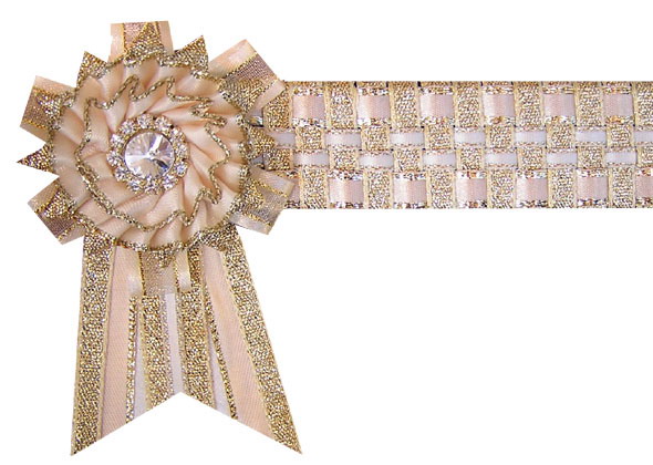 | Cream / gold Satin : metallic Ribbon + Daimante Rings in rosettes |